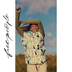 FP Movement “In A Bubble” Printed Puffer Vest in Blocked Logo, PrimaLoft ThermoPlume–insulated, slouchy hip-length fit with funnel neckline, front double zip closure, snap-vented sides, and colorful allover pastel MOVEMENT block-letter print, New With Tags in multiple sizes, perfect lightweight-yet-warm studio-to-street outerwear for chilly commutes and everyday layering.