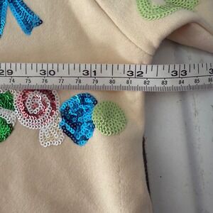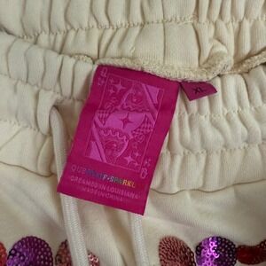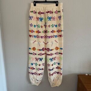 Vibrant pajama set with candy and bow designs. Features a cream base with multicolored accents. Comfortable and stylish for lounging. Shirt 1XL pants XL