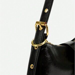 Features: Chic faux leather handbag featuring a buckle detail, adjustable strap for a customizable fit, rivets for an edgy vibe, and a secure zipper closure. Perfect for carrying your essentials in style.