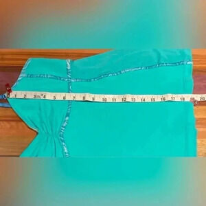 Turquoise tank with swirled trim accent. Straps can be crossed in back or worn straight.