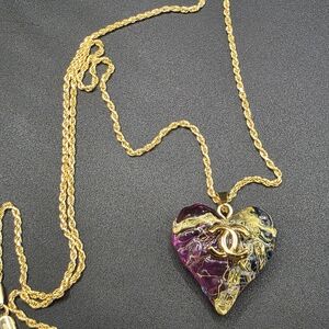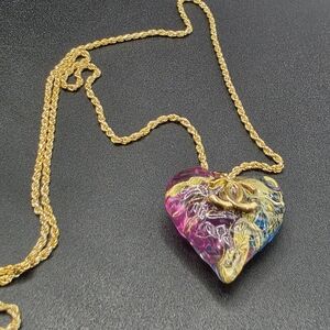 Make a bold statement with this eye-catching heart pendant necklace ✨ Featuring a glossy, multicolor resin heart with a marbled blend of pink, purple, blue, and gold tones. The pendant is accented with a gold-tone heart emblem and paired with a classic rope-style chain for a luxe finish.