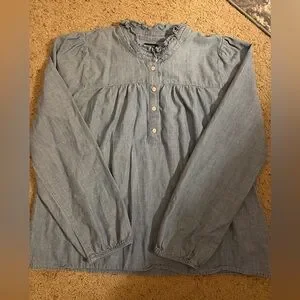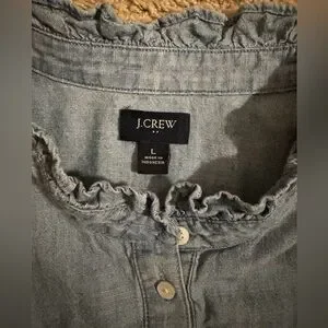 J. Crew Chambray top. Features a ruffle neck, buttons on the front, and long sleeves with elastic wrists. Material looks like denim, but is lightweight and comfortable. Women's size large.