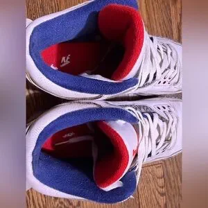 Stylish Jordan athletic shoes. White base with blue interior. Red accents on tongue and eyelets. Perfect for sports and casual wear.