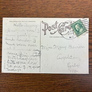 - A snowy scene framed by holly, including a couple by a fence with a cabin and woods in the background. A Christmas poem is on the bottom. Embossed border and holly. Posted to Missouri with stamp in 1909.