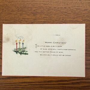 - Set of twisted taper candles with greenery, a Merry Christmas poem. Made in the USA, No. 4011. Posted to Missouri with stamp in 1922.