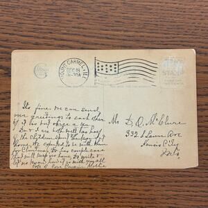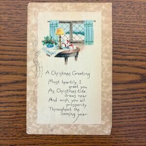 - Indoor scene with snow outdoors, blue curtains, a vase of holley, lamp, and presents on a table. "A Christmas Greeting" poem. From Gibson Card Company. Posted to Missouri, no stamp. Year is too light to read.