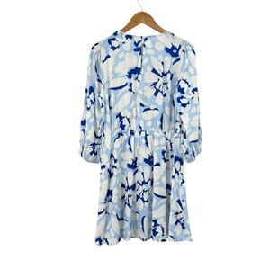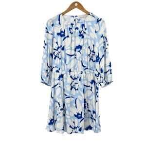 LOFT Blue & White Floral Print Linen Blend Elastic Waist Summer Blouson Dress
