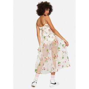 strawberries, an empire waist, and a back zipper closure.