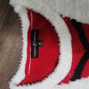 Festive red and white sweater. Santa-inspired design. Black belt detail. Perfect for holiday parties.