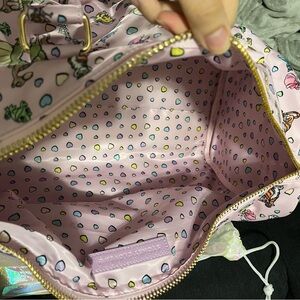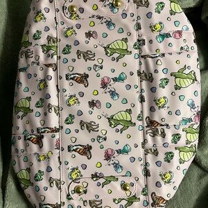 Vibrant backpack with cartoon character print. Features a playful design with hearts and animals.