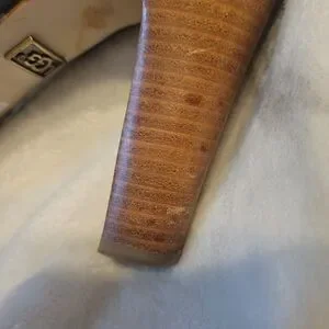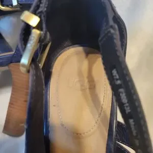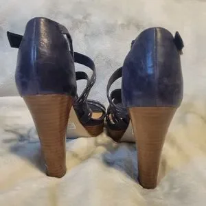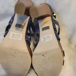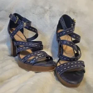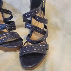 Chic navy heels with strappy design. Perfect blend of style and comfort. Some scuffing on one of the heels as seen in pic.