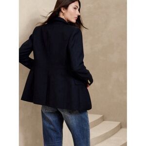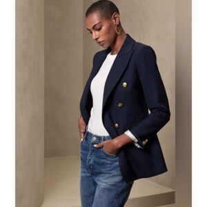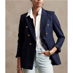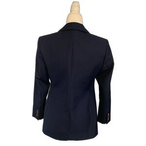 The Banana Republic Icon Captain Blazer in navy blue is a stylish and sophisticated addition to any woman's wardrobe. Made from a wool blend outer shell, this blazer features lion gold buttons and is designed specifically for petites in size 2P. The classic blazer style, paired with the trendy metal theme, makes it a versatile piece that can elevate any outfit with its sharp and tailored look. Perfect for the fashion-forward woman looking to make a statement with her outerwear.