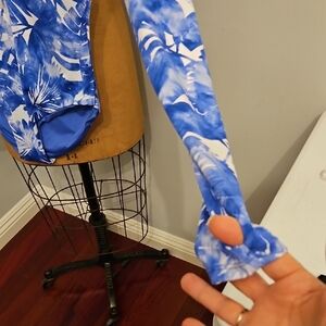 Long-sleeve Swimsuit/Rashgyard with vibrant blue and white design. Long front zipper makes on and off easy. Built in bra with removable pads. Sleeves had thumb hole to keep sleeves in place. Very Flattering on.