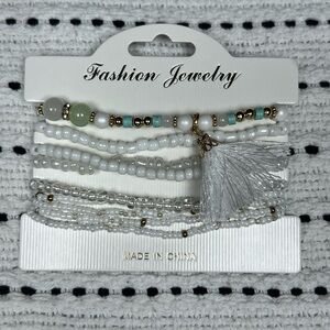 Boho White Pastel Bead Bracelet Set,elastic stretch bracelets, white tassel