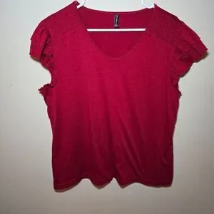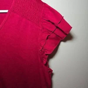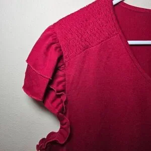 Elevate your casual wardrobe with this charming red top featuring delicate ruffle sleeves and a flattering V-neckline. The soft, comfortable fabric drapes beautifully while the feminine ruffle details add a romantic touch. Perfect for summer brunches, casual office days, or weekend outings. Pair with jeans for an effortless look or dress it up with a skirt for special occasions. The versatile design transitions seamlessly from day to evening wear. Excellent Pre-Loved Condition with no known Flaws! See photos for Measurements!