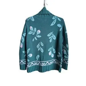 A lovely cottagecore style chunky knit turtleneck sweater from Tuckernuck. This piece is done in a lovely shade of green called Juniper and features an allover floral design with ribbed accents at the neck and hem. An oversized silhouette allows for styling options; wear with leggings, wrap with a belt for a cropped look, or pair with your favorite jeans and uggs for a comfy casual look.