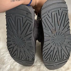 Cozy gray slippers with fluffy lining. Features UGG branded strap. Perfect for comfort and style.