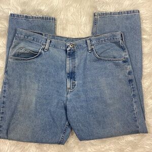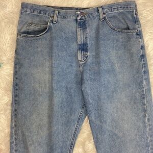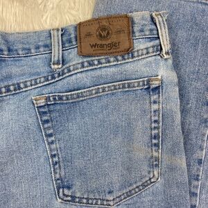 Wrangler’s Men’s Light Wash 100% Cotton Denim Jeans with Slight Distressing on Hems. 5 Pocket Design, Button/Fly.