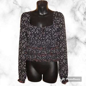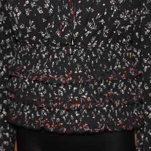 Featuring an all-black floral print with intricate ruching, this stylish top adds a hint of elegance to any outfit.