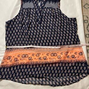 -Features: Vanity size large navy blue tank top. It is see through and would need to wear a undershirt with it. No stains or holes.