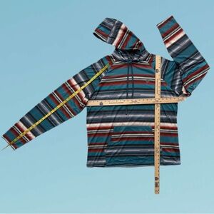 Eye-catching piece features a vibrant southwestern stripe print in shades of teal, red, black, and white.