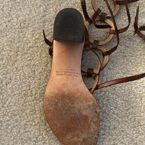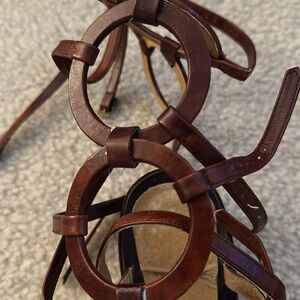 Very cool statement sandals from the 1960s. Leather is a bit stiff (they’re vintage!) but otherwise in good shape. Made in Italy. Designed by Degas, sold by Saks Fifth Avenue. See pics for slight toe marks. Heels are perfect condition without scuffs.