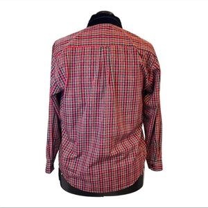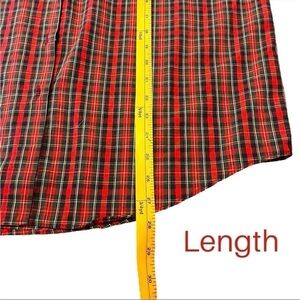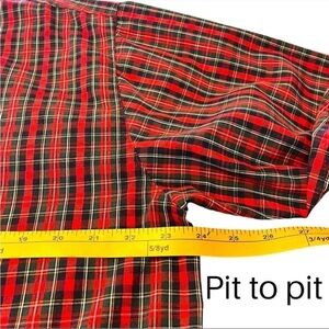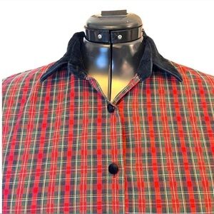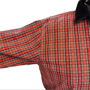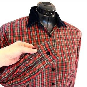 Terrific vintage single needle stitched Tabi plaid button up shirt works great on Christmas Day and throughout the winter. The velvet collar and buttons pop against the red plaid. Single needle tailoring is considered superior. Almost no brands (except maybe Polo) sold in department stores use it. Single needle tailoring creates a more refined, smooth seam that doesn't pucker like with double needle tailoring.
