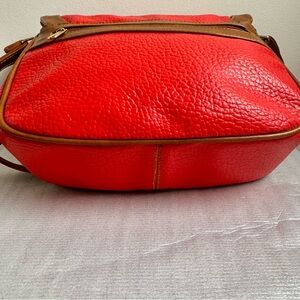 This handbag is a vintage Dooney & Bourke All-Weather Leather duck bag in red with brown "British Tan" leather trim. This style is a classic design from the 1980s or 1990s, known for its durable, pebbled leather.