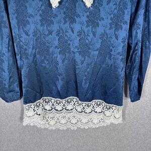 Vintage 80s Scott McClintock Lace Blouse Size 10 Navy Blue Victorian Cottage Prairie Satin Damask Jacquard Tunic Collar Bib Sailor Feminine Romantic Mediterranean Shoulder Pads Puff Long Sleeve Floral Coquette