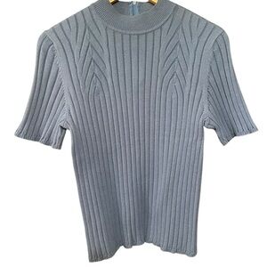 Gorgeous sweater blouse in a soft blue. Features a zippered back and fitted neckline. Give yourself a look that can be dressed up or down with this blouse in excellent condition!