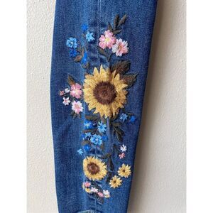 Classic high rise skinny with bold red and yellow sunflower/floral embroidery on a medium wash