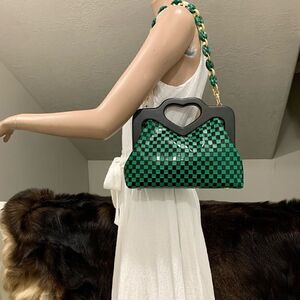 Handmade genuine cowhide with embossed check pattern. Chic cut-out sweet heart handle. Includes 1 chain and 1 leather strap. Use in multiple ways, hand carry, shoulder bag or crossbody. This wooden frame bag holds a lot, spacious enough for your phone, large wallet, book, cosmetics, compact umbrella & other items. Accessorize as a day or evening bag, or a gift for an important someone.