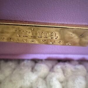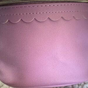 Chic pink cosmetic bag by Trina Turk. Features a scalloped edge and gold zipper. Perfect for organizing essentials. Comes filled with goodies inside.