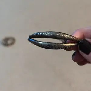 Elegant silver tone bracelet with intricate engravings. Adjustable fit for comfort.