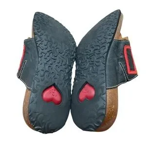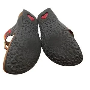 Vibrant sandals with geometric design. Features red, yellow, and green accents on black base.
