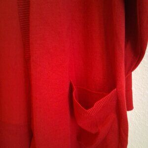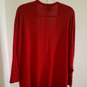 This Terra & Sky cardigan is a women's plus-size, open-front sweater designed for a relaxed and comfortable fit. It is described as a fine-gauge, lightweight knit, making it suitable for layering in transitional seasons. It features an open-front cardigan with a V-neckline. The cardigan comes with two front patch pockets. It has long sleeves and a drop-shoulder design. The fabric is a blend of 78 % rayon and 22% polyester, which is described as soft and stretchy. It is machine washable for easy care. It has a relaxed, longer length and the pit-to-pit measures 24".