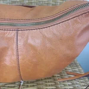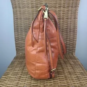 Stylish orange leather hobo bag. Features a slouchy design. Includes side zippers and shoulder strap.