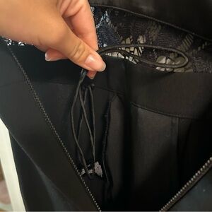 A beautiful black, lace jumpsuit by Alice + Olivia has wide legs and pockets! The top portion is lace overlay with a bandeau built in lining. Zips up in back. A perfect closet staple to have to wear to a wedding, date night and parties.