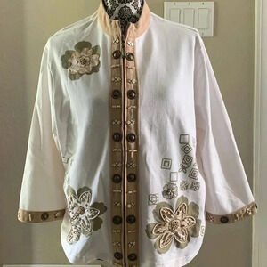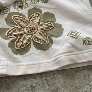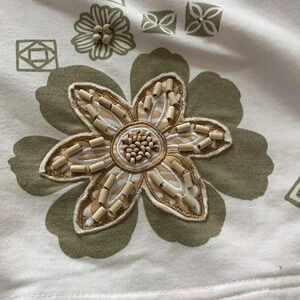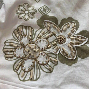 This blouse is so cute. It has embroidery and different types of beading or sequins. The colors work well together in tan green and off-white. Looks like under one flower the color maybe a hair darker usually I can tell of there was a color bleed but it's really light making it hard to tell so I just put it in photo.