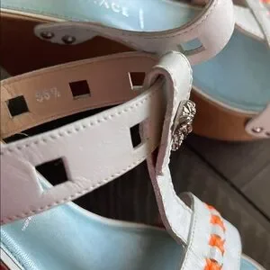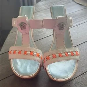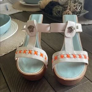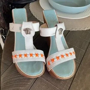 Stylish white sandals featuring orange accents and a silver medallion detail. Perfect for a chic look.