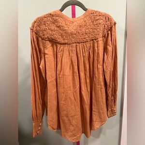 Stylish terracotta blouse with intricate detailing. Button-up front. Perfect for casual outings.