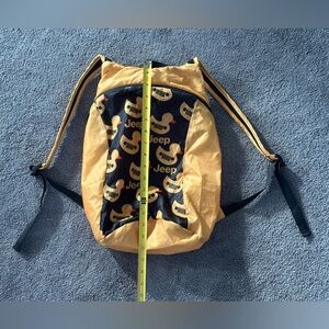 Vibrant Jeep backpack with duck design. Yellow and black colors. Drawstring closure.
