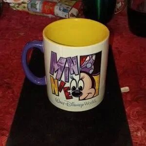 Charming Disney mug featuring Minnie Mouse. Purple handle with a vibrant yellow interior. Perfect for fans.