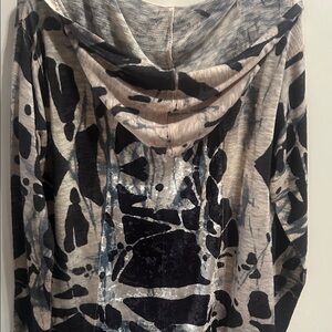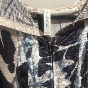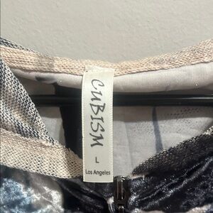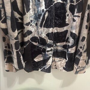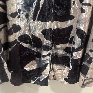 Discover a unique style with this abstract patterned women's jacket. Featuring a blend of black, gray, and cream, this piece adds a modern touch to your wardrobe. Perfect for any casual outing.
