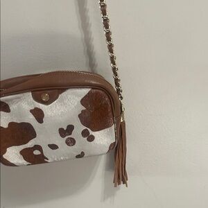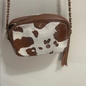 Add a touch of chic to your ensemble with this stylish cowhide crossbody bag. The brown and white design offers a unique flair, perfect for any occasion.