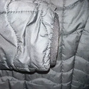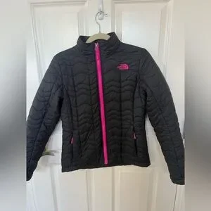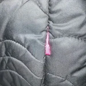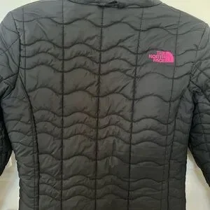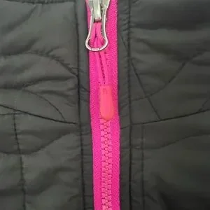 Black quilted jacket featuring a bold pink logo. Perfect for outdoor adventures, stylish with pink trim. Great lightweight but warm jacket! So cute on!