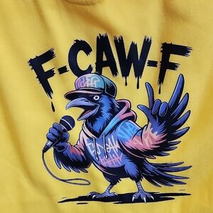 Bright yellow hoodie featuring a bold graphic design. Perfect for casual wear.