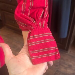 Authentic Native Tunic with vented underarm and stabilizers at cuffs. Comes with original fabric belt. Concho belt is NOT included! Vibrant red tunic featuring intricate embroidery and a stylish belt. Perfect for a bold fashion statement. V-Neck and long sleeves also with a beautiful fringed rear hem. See measurements. Our model is 5’ 6” and 115lbs and it fits oversized so calling her a Medium.