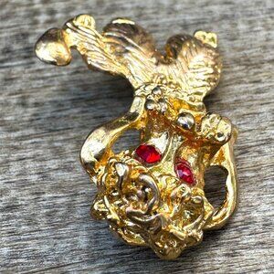 This item is a vintage gold-tone poodle brooch featuring red rhinestone eyes. Similar items are often dated to the 1960s or 1970s and are a popular form of costume jewelry.