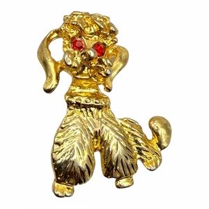 Design The brooch features a gold-tone metal with a highly textured body representing the poodle's signature "poodle cut" fur. It has two bright red rhinestones for eyes.